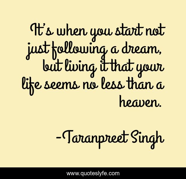 This page presents the quote "It’s when you start not just following a dream, but living it that your life seems no less than a heaven.". Author of this quote is Taranpreet Singh. This quote is about life, perception, love, failure, reality, imagination, achievement, thoughts-of-the-mind, dreams,.