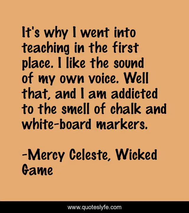This page presents the quote "It's why I went into teaching in the first place. I like the sound of my own voice. Well that, and I am addicted to the smell of chalk and white-board markers.". Author of this quote is Mercy Celeste, Wicked Game. This quote is about teaching, teacher,.