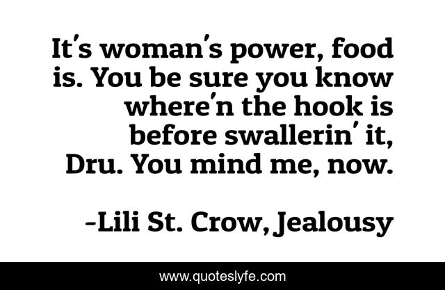 This page presents the quote "It's woman's power, food is. You be sure you know where'n the hook is before swallerin' it, Dru. You mind me, now.". Author of this quote is Lili St. Crow, Jealousy. This quote is about food, woman, humor,.