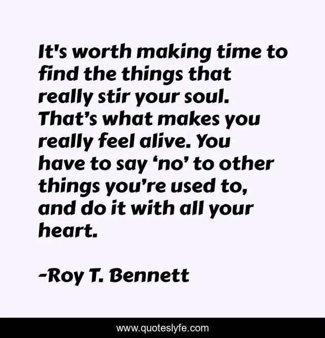 This page presents the quote "It's worth making time to find the things that really stir your soul. That’s what makes you really feel alive. You have to say ‘no’ to other things you’re used to, and do it with all your heart.". Author of this quote is Roy T. Bennett. This quote is about heart, inspiring, inspire, soul, living, positive, positive-affirmation, life, confidence,.