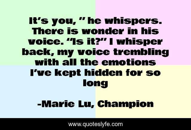 This page presents the quote "It’s you, ” he whispers. There is wonder in his voice. “Is it?” I whisper back, my voice trembling with all the emotions I’ve kept hidden for so long". Author of this quote is Marie Lu, Champion. This quote is about epilogue, june, day,.