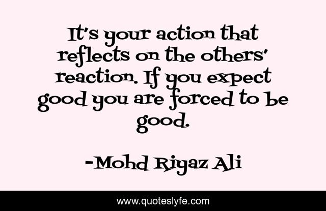 This page presents the quote "It’s your action that reflects on the others’ reaction. If you expect good you are forced to be good.". Author of this quote is Mohd Riyaz Ali. This quote is about action-reaction, good, behave,.