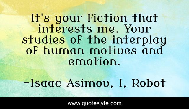 This page presents the quote "It's your fiction that interests me. Your studies of the interplay of human motives and emotion.". Author of this quote is Isaac Asimov, I, Robot. This quote is about literature, psychology,.
