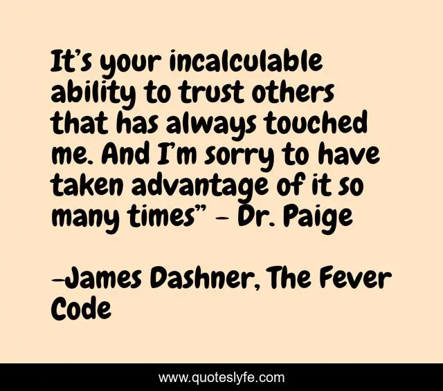 This page presents the quote "It’s your incalculable ability to trust others that has always touched me. And I’m sorry to have taken advantage of it so many times” - Dr. Paige". Author of this quote is James Dashner, The Fever Code. This quote is about the-maze-runner, thomas, take-advantage, betrayal, the-fever-code, betrayed, trust,.