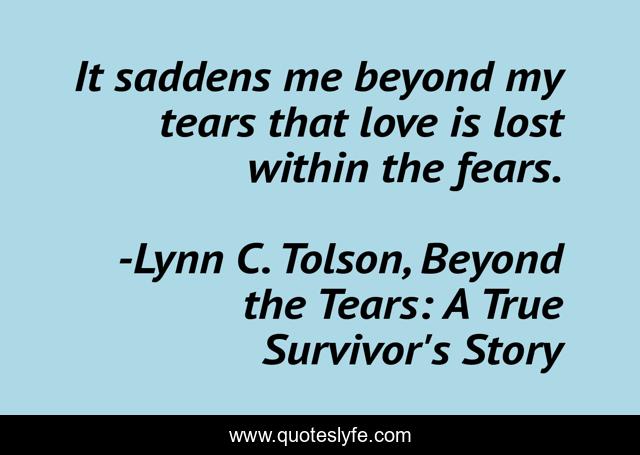This page presents the quote "It saddens me beyond my tears that love is lost within the fears.". Author of this quote is Lynn C. Tolson, Beyond the Tears: A True Survivor's Story. This quote is about emotional, philosophical, inspirational, enthusiasm,.