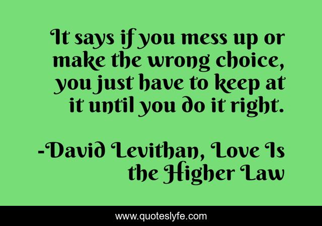 This page presents the quote "It says if you mess up or make the wrong choice, you just have to keep at it until you do it right.". Author of this quote is David Levithan, Love Is the Higher Law. This quote is about try, life, options, choices,.