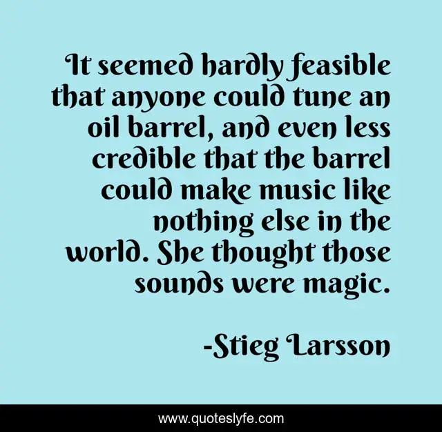 This page presents the quote "It seemed hardly feasible that anyone could tune an oil barrel, and even less credible that the barrel could make music like nothing else in the world. She thought those sounds were magic.". Author of this quote is Stieg Larsson. This quote is about magic, music,.