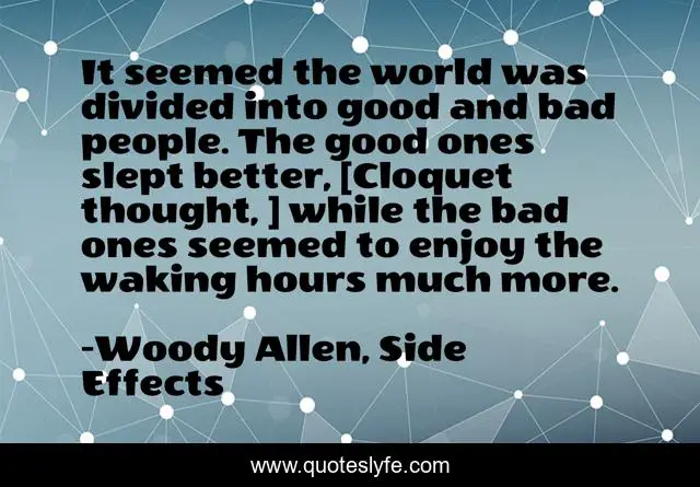 This page presents the quote "It seemed the world was divided into good and bad people. The good ones slept better, [Cloquet thought, ] while the bad ones seemed to enjoy the waking hours much more.". Author of this quote is Woody Allen, Side Effects. This quote is about bad, good, sleep,.