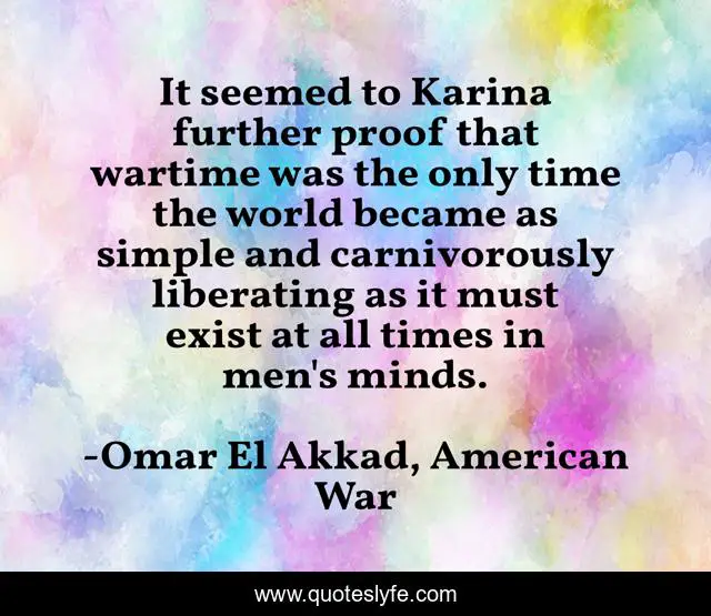 This page presents the quote "It seemed to Karina further proof that wartime was the only time the world became as simple and carnivorously liberating as it must exist at all times in men's minds.". Author of this quote is Omar El Akkad, American War. .