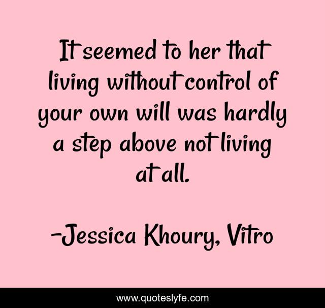 This page presents the quote "It seemed to her that living without control of your own will was hardly a step above not living at all.". Author of this quote is Jessica Khoury, Vitro. This quote is about control, living, life, vitro, scifi,.