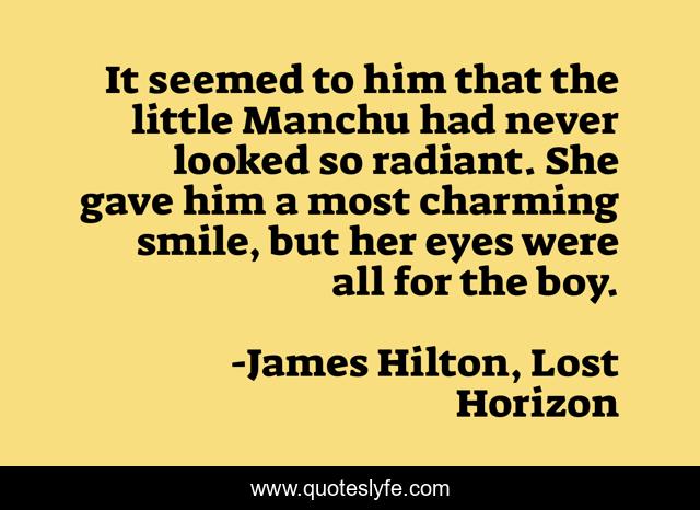 This page presents the quote "It seemed to him that the little Manchu had never looked so radiant. She gave him a most charming smile, but her eyes were all for the boy.". Author of this quote is James Hilton, Lost Horizon. This quote is about chances, lost, love, shangri-la, affection,.