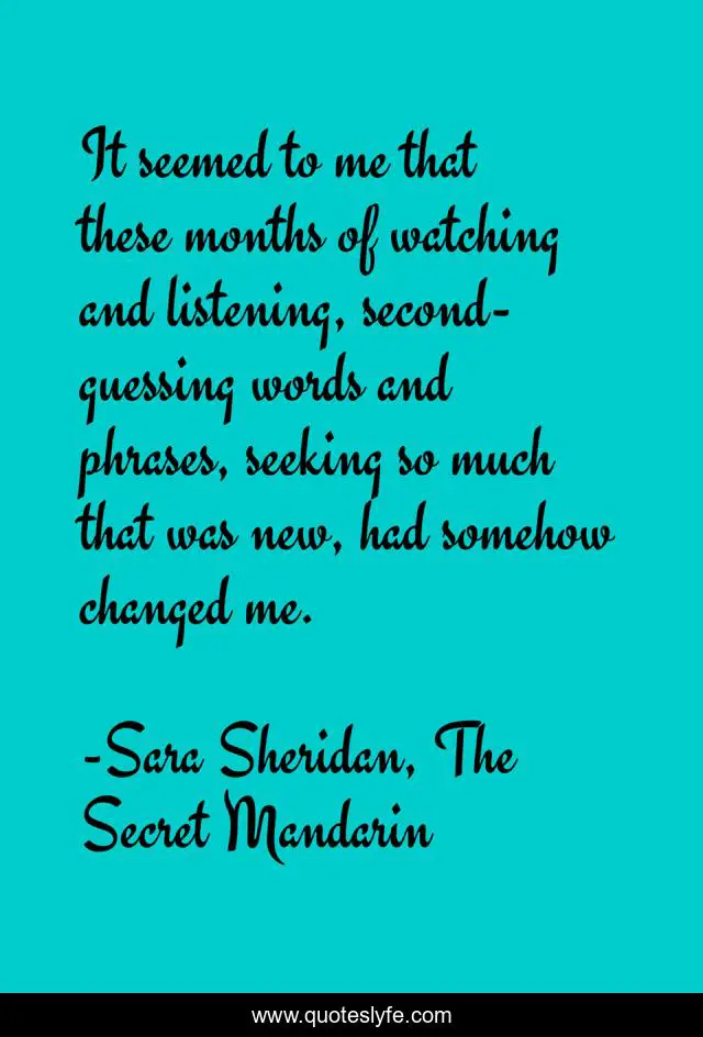 This page presents the quote "It seemed to me that these months of watching and listening, second-guessing words and phrases, seeking so much that was new, had somehow changed me.". Author of this quote is Sara Sheridan, The Secret Mandarin. This quote is about travel, unfamiliarity, change,.