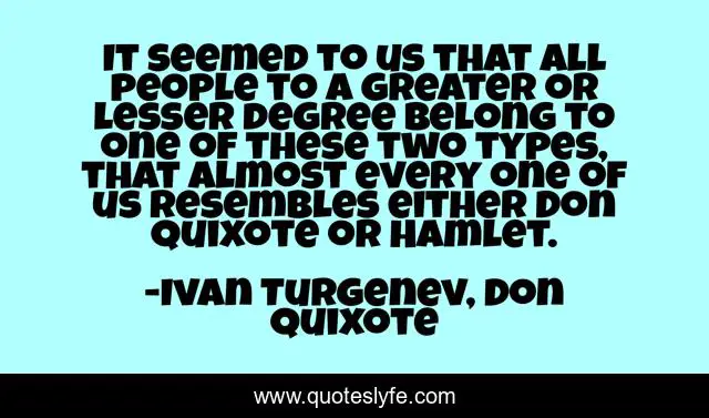 This page presents the quote "It seemed to us that all people to a greater or lesser degree belong to one of these two types, that almost every one of us resembles either Don Quixote or Hamlet.". Author of this quote is Ivan Turgenev, Don Quixote. This quote is about human-nature, tragedy, comedy, humanity, tragicomedy,.