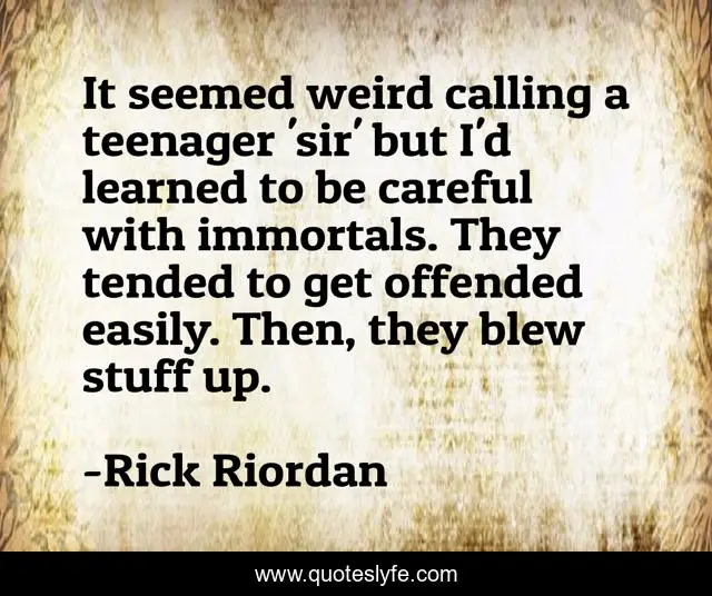 This page presents the quote "It seemed weird calling a teenager 'sir' but I'd learned to be careful with immortals. They tended to get offended easily. Then, they blew stuff up.". Author of this quote is Rick Riordan. This quote is about humor, teenager, explosions, immortals,.