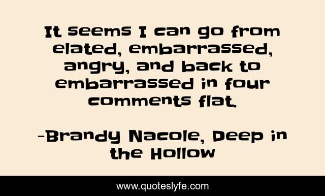 This page presents the quote "It seems I can go from elated, embarrassed, angry, and back to embarrassed in four comments flat.". Author of this quote is Brandy Nacole, Deep in the Hollow. This quote is about embarrassed, ghosts, jo, paranormal, paranormal-thriller,.