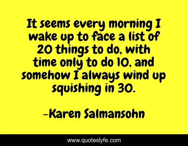 This page presents the quote "It seems every morning I wake up to face a list of 20 things to do, with time only to do 10, and somehow I always wind up squishing in 30.". Author of this quote is Karen Salmansohn. This quote is about wake up, wind, time,.
