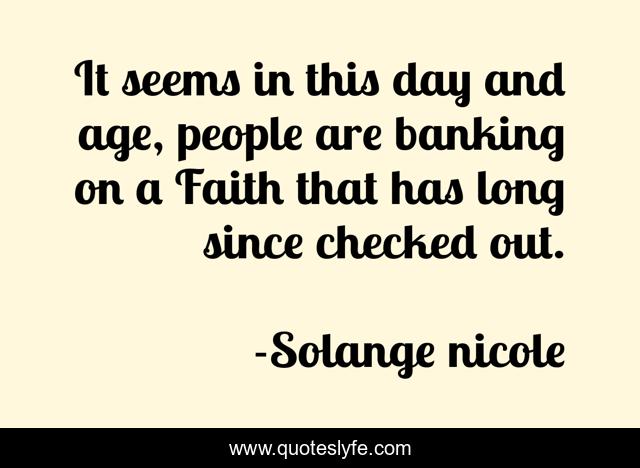 This page presents the quote "It seems in this day and age, people are banking on a Faith that has long since checked out.". Author of this quote is Solange nicole. This quote is about faith, philosophical, philosophy, belief, spiritual,.