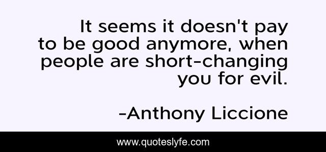 This page presents the quote "It seems it doesn't pay to be good anymore, when people are short-changing you for evil.". Author of this quote is Anthony Liccione. This quote is about morals, evil, intentions, good-samaritan, conduct, short-changing,.