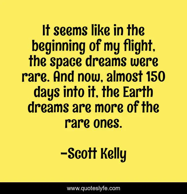 This page presents the quote "It seems like in the beginning of my flight, the space dreams were rare. And now, almost 150 days into it, the Earth dreams are more of the rare ones.". Author of this quote is Scott Kelly. This quote is about earth, beginning, space,.