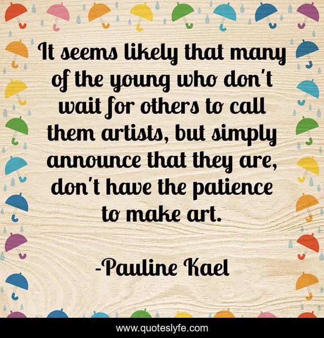 This page presents the quote "It seems likely that many of the young who don't wait for others to call them artists, but simply announce that they are, don't have the patience to make art.". Author of this quote is Pauline Kael. This quote is about art, young, wait,.