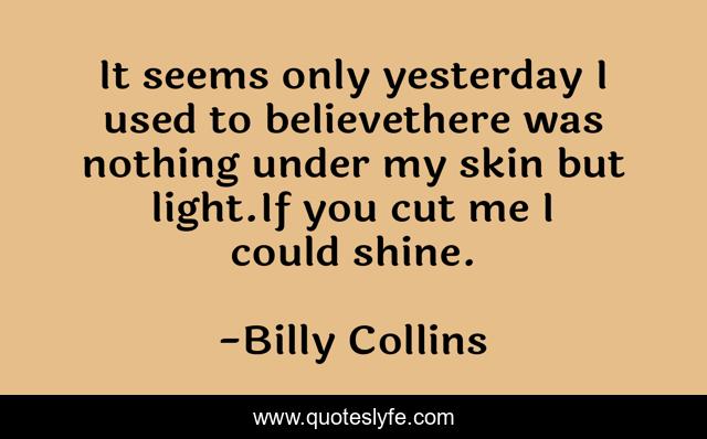 This page presents the quote "It seems only yesterday I used to believethere was nothing under my skin but light.If you cut me I could shine.". Author of this quote is Billy Collins. .