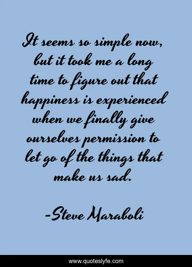 This page presents the quote "It seems so simple now, but it took me a long time to figure out that happiness is experienced when we finally give ourselves permission to let go of the things that make us sad.". Author of this quote is Steve Maraboli. This quote is about life, happiness, truth, sad,.