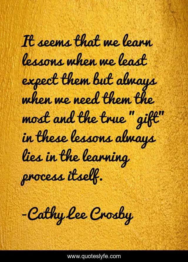 This page presents the quote "It seems that we learn lessons when we least expect them but always when we need them the most and the true "gift" in these lessons always lies in the learning process itself.". Author of this quote is Cathy Lee Crosby. .