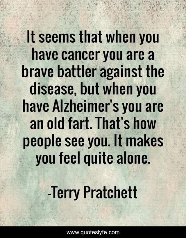 This page presents the quote "It seems that when you have cancer you are a brave battler against the disease, but when you have Alzheimer's you are an old fart. That's how people see you. It makes you feel quite alone.". Author of this quote is Terry Pratchett. This quote is about brave, cancer, people,.