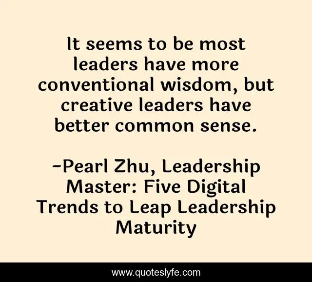 This page presents the quote "It seems to be most leaders have more conventional wisdom, but creative leaders have better common sense.". Author of this quote is Pearl Zhu, Leadership Master: Five Digital Trends to Leap Leadership Maturity. This quote is about leadership, creativity,.