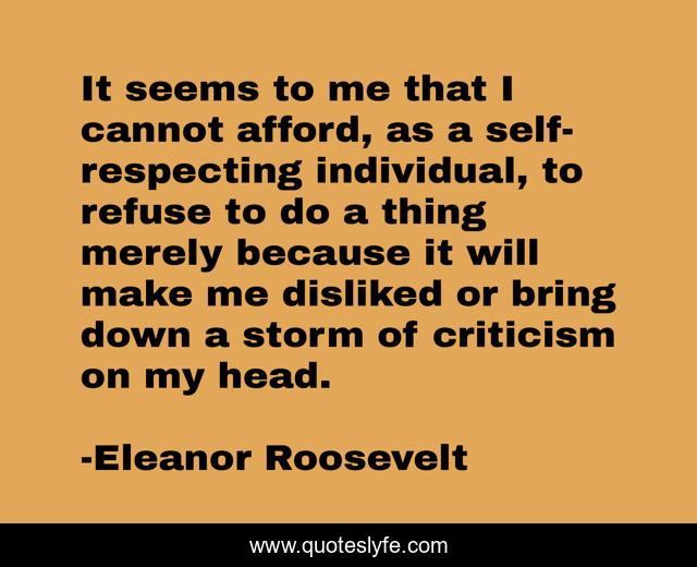 This page presents the quote "It seems to me that I cannot afford, as a self-respecting individual, to refuse to do a thing merely because it will make me disliked or bring down a storm of criticism on my head.". Author of this quote is Eleanor Roosevelt. This quote is about enthusiasm, confidence, inspirational,.