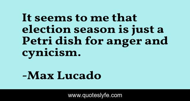 This page presents the quote "It seems to me that election season is just a Petri dish for anger and cynicism.". Author of this quote is Max Lucado. This quote is about me, season, election,.