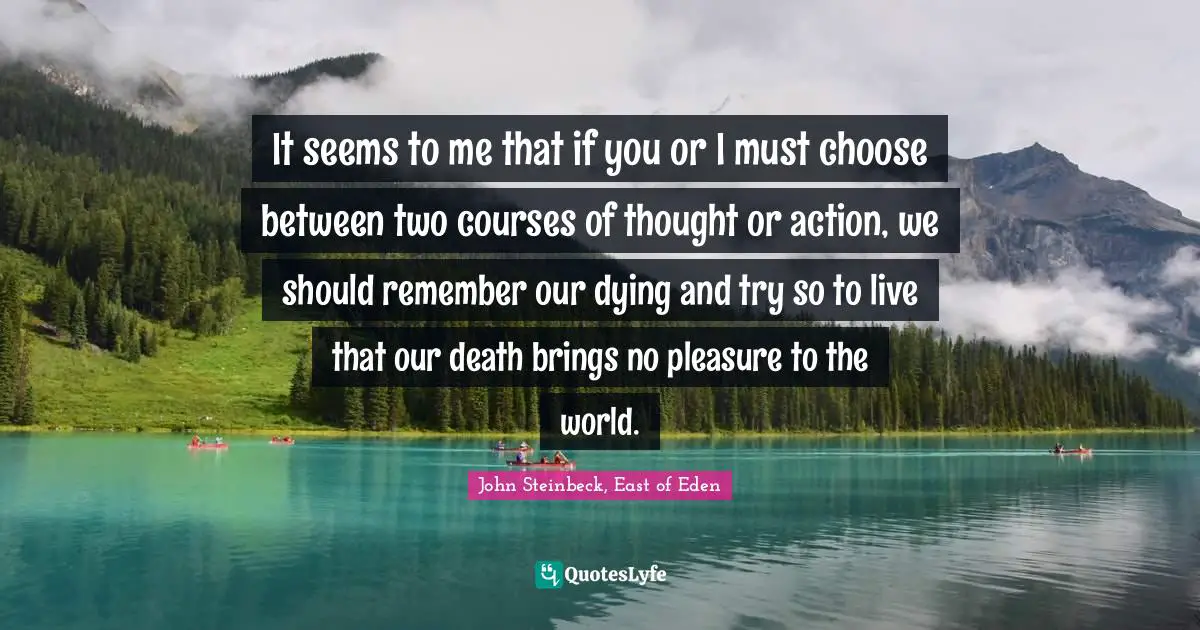 This page presents the quote "It seems to me that if you or I must choose between two courses of thought or action, we should remember our dying and try so to live that our death brings no pleasure to the world.". Author of this quote is John Steinbeck, East of Eden. .