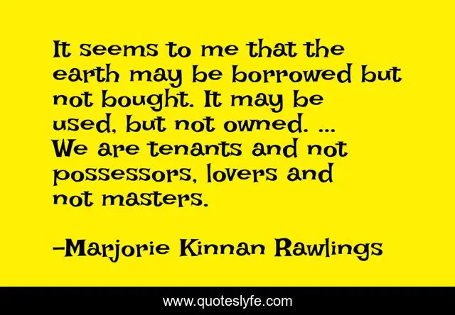 This page presents the quote "It seems to me that the earth may be borrowed but not bought. It may be used, but not owned. ... We are tenants and not possessors, lovers and not masters.". Author of this quote is Marjorie Kinnan Rawlings. .