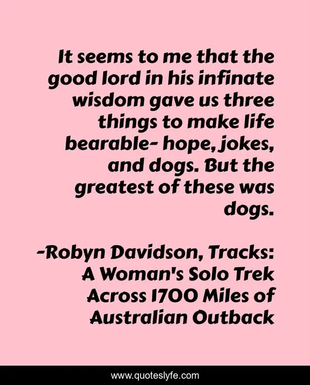This page presents the quote "It seems to me that the good lord in his infinate wisdom gave us three things to make life bearable- hope, jokes, and dogs. But the greatest of these was dogs.". Author of this quote is Robyn Davidson, Tracks: A Woman's Solo Trek Across 1700 Miles of Australian Outback. This quote is about robyn-davidson, tracks, australia, dogs,.