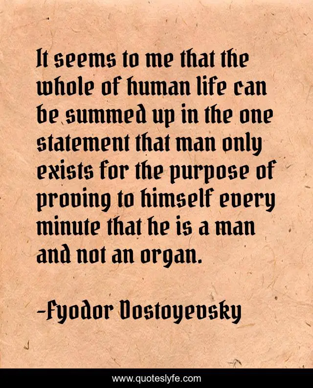 This page presents the quote "It seems to me that the whole of human life can be summed up in the one statement that man only exists for the purpose of proving to himself every minute that he is a man and not an organ.". Author of this quote is Fyodor Dostoyevsky. This quote is about existence, life, mankind,.