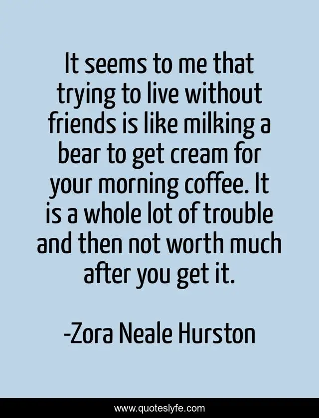 This page presents the quote "It seems to me that trying to live without friends is like milking a bear to get cream for your morning coffee. It is a whole lot of trouble and then not worth much after you get it.". Author of this quote is Zora Neale Hurston. .