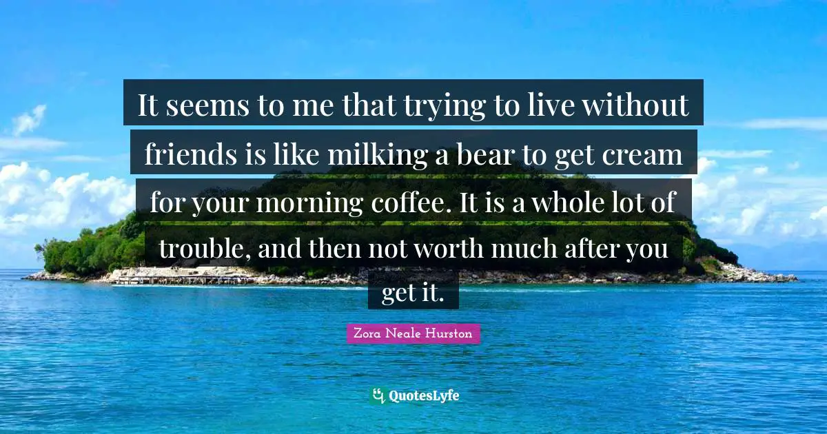 This page presents the quote "It seems to me that trying to live without friends is like milking a bear to get cream for your morning coffee. It is a whole lot of trouble, and then not worth much after you get it.". Author of this quote is Zora Neale Hurston. This quote is about friendship, coffee, friends,.