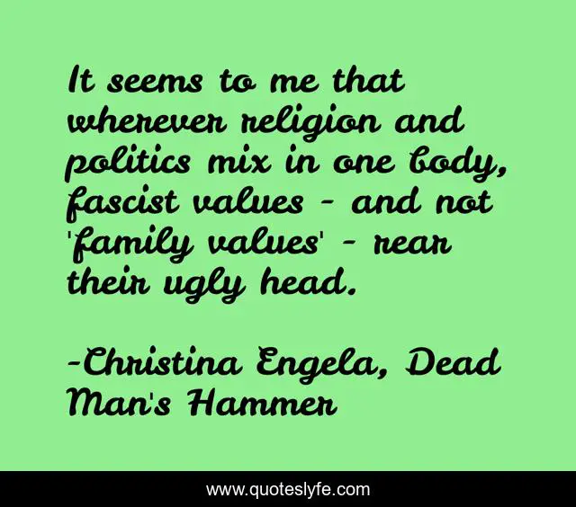 This page presents the quote "It seems to me that wherever religion and politics mix in one body, fascist values - and not 'family values' - rear their ugly head.". Author of this quote is Christina Engela, Dead Man's Hammer. This quote is about family-values, mix, ugly, religion, politics, fascist-values,.