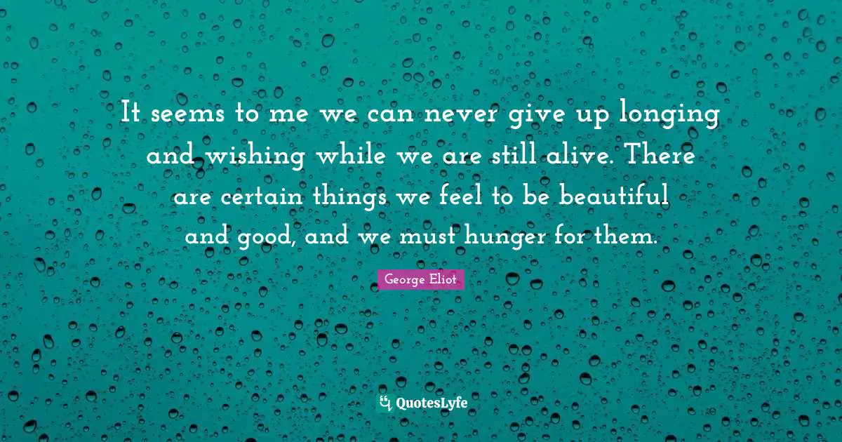 This page presents the quote "It seems to me we can never give up longing and wishing while we are still alive. There are certain things we feel to be beautiful and good, and we must hunger for them.". Author of this quote is George Eliot. This quote is about hunger, living, wish, wishing, longing,.
