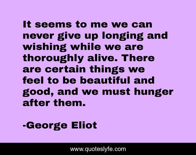This page presents the quote "It seems to me we can never give up longing and wishing while we are thoroughly alive. There are certain things we feel to be beautiful and good, and we must hunger after them.". Author of this quote is George Eliot. This quote is about beautiful, good,.