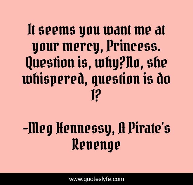 This page presents the quote "It seems you want me at your mercy, Princess. Question is, why?No, she whispered, question is do I?". Author of this quote is Meg Hennessy, A Pirate's Revenge. .