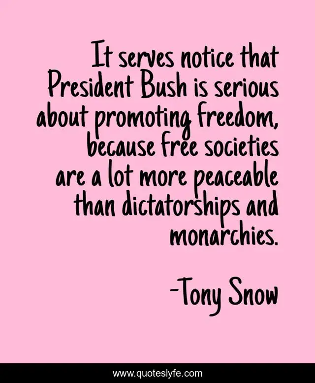 This page presents the quote "It serves notice that President Bush is serious about promoting freedom, because free societies are a lot more peaceable than dictatorships and monarchies.". Author of this quote is Tony Snow. This quote is about president, free, serious,.