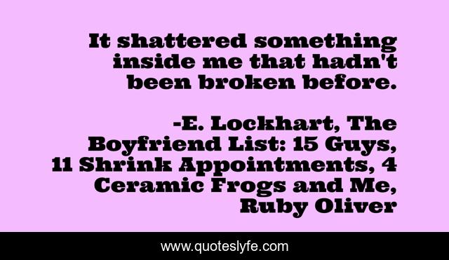 "E. Lockhart, The Boyfriend List: 15 Guys, 11 Shrink Appointments, 4 Ceramic Frogs and Me, Ruby Oliver Quotes." Quoteslyfe.com, 2025. Fri. 05 Dec. 2025. <https://www.quoteslyfe.com/quote/It-shattered-something-inside-me-that-hadn-888>.