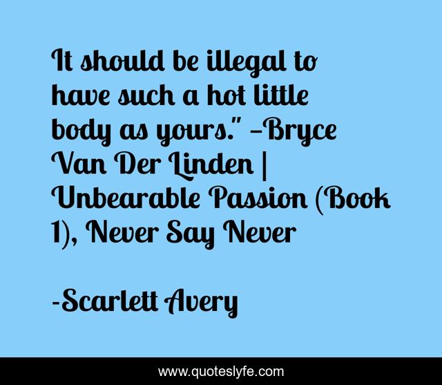 This page presents the quote "It should be illegal to have such a hot little body as yours." —Bryce Van Der Linden | Unbearable Passion (Book 1), Never Say Never". Author of this quote is Scarlett Avery. This quote is about romance, erotic-romance,.