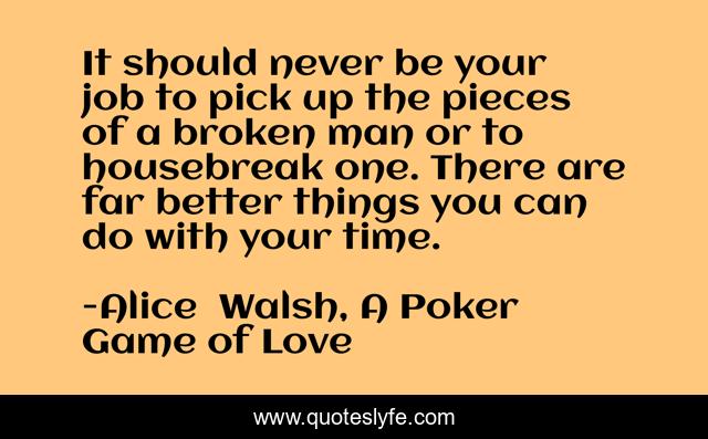This page presents the quote "It should never be your job to pick up the pieces of a broken man or to housebreak one. There are far better things you can do with your time.". Author of this quote is Alice Walsh, A Poker Game of Love. This quote is about hard-truths, love-story, reality-check,.
