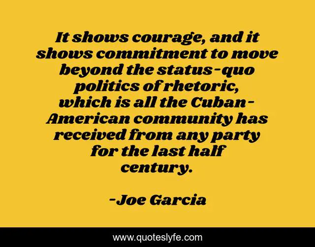 This page presents the quote "It shows courage, and it shows commitment to move beyond the status-quo politics of rhetoric, which is all the Cuban-American community has received from any party for the last half century.". Author of this quote is Joe Garcia. This quote is about politics, community,.