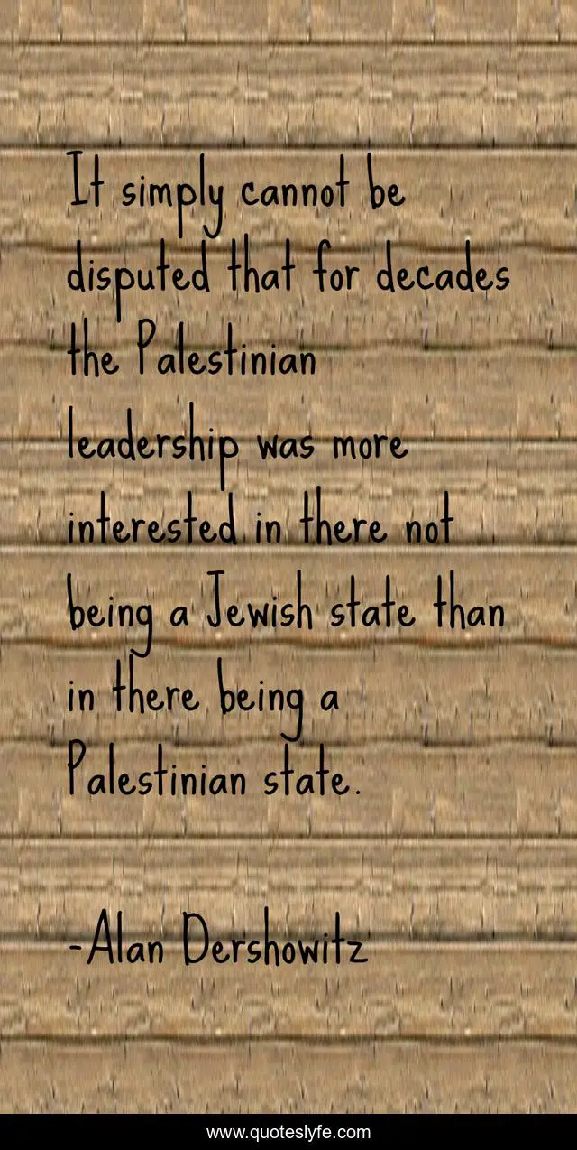 This page presents the quote "It simply cannot be disputed that for decades the Palestinian leadership was more interested in there not being a Jewish state than in there being a Palestinian state.". Author of this quote is Alan Dershowitz. This quote is about jewish, being, decades,.
