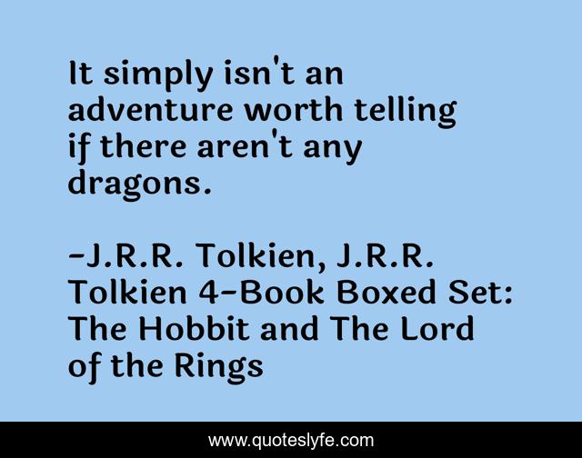 This page presents the quote "It simply isn't an adventure worth telling if there aren't any dragons.". Author of this quote is J.R.R. Tolkien, J.R.R. Tolkien 4-Book Boxed Set: The Hobbit and The Lord of the Rings. This quote is about fantasy, dragons,.
