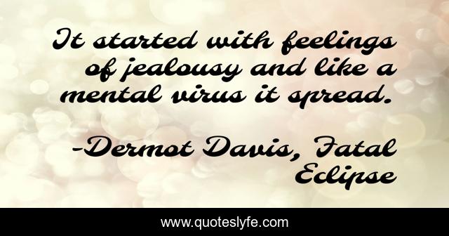 This page presents the quote "It started with feelings of jealousy and like a mental virus it spread.". Author of this quote is Dermot Davis, Fatal Eclipse. This quote is about jealous-hero, jealousy, marriage, suspense, fidelity, obsession, psychological-thriller,.