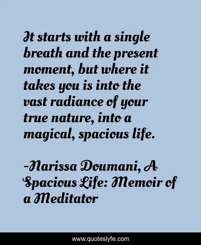 This page presents the quote "It starts with a single breath and the present moment, but where it takes you is into the vast radiance of your true nature, into a magical, spacious life.". Author of this quote is Narissa Doumani, A Spacious Life: Memoir of a Meditator. This quote is about enthusiasm, meditation, memoir, inspirational, mindfulness,.